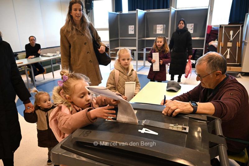 18-3-2026, Nederland, Woezik stembureau tijdens gemeenteraadsverkiezingen Op de Paschalisschool kan gestemd worden. Kinderen mogen samen met hun ouders stemmen voordat hun school begint. (niet voor Trouw, Parool, AD en NRC)
