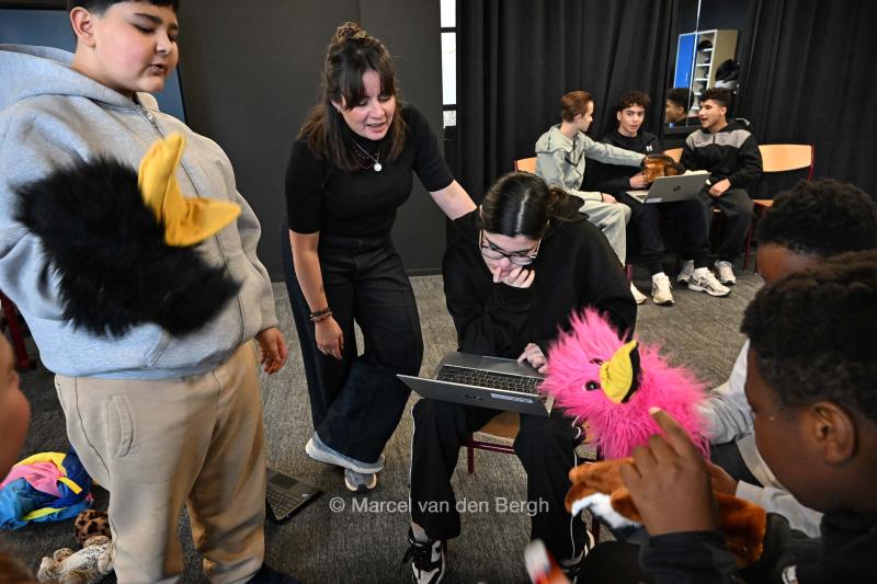 27-1-2026, Nederland, Arnhem Leerlingen van VMBO school Maarten van Rossem werken gericht met AI-leerapps bij het vak drama. De les gaat over script schrijven. Docente Roos Veenvliet legt uit. (niet voor Trouw, Parool, AD en NRC)