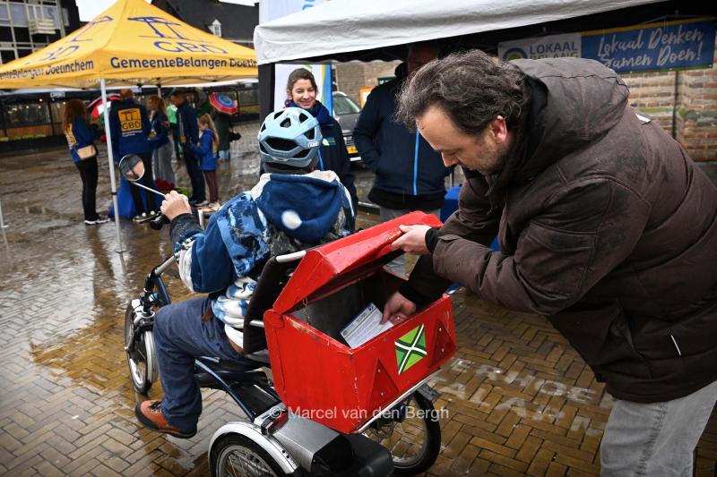 14-3-2026, Nederland, Doetinchem Diverse partijen flyeren in het stadscentrum voor de gemeenteraadsverkiezingen. Een medewerker van Lokaal Belang legt een folder in een kistje van een voorbijganger. (niet voor Trouw, Parool, AD en NRC)