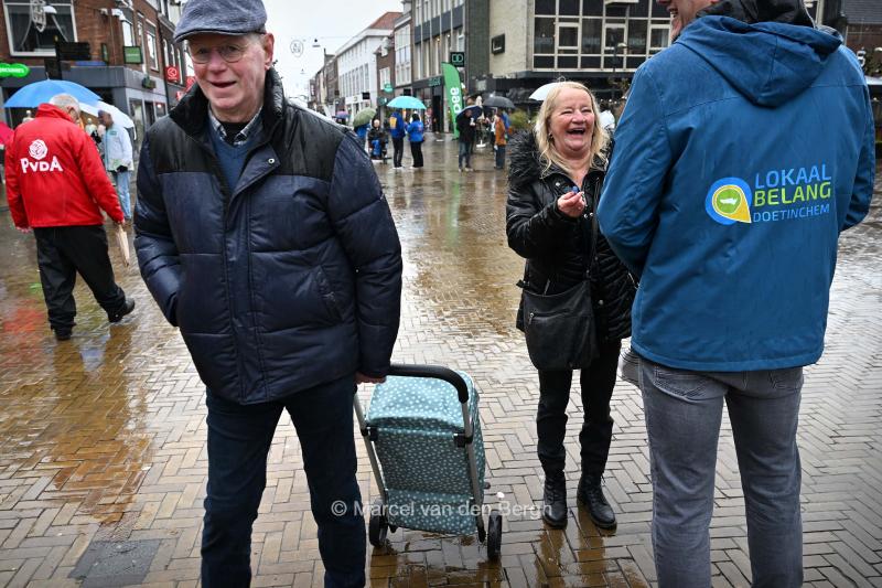 Diverse partijen flyeren in het stadscentrum voor de gemeenteraadsverkiezingen.
