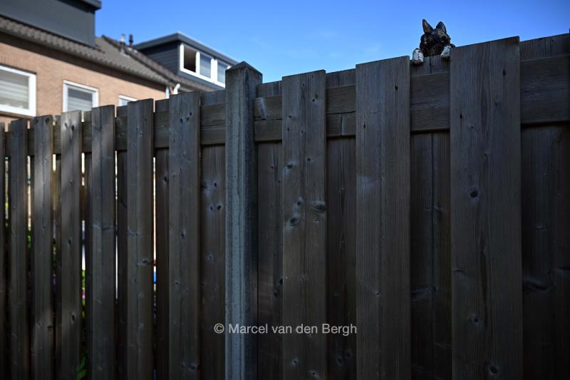 VRIJ 29-8-2024, Nederland, Tiel beeldje van kat aan houten schutting foto Marcel van den Bergh (niet voor Trouw, Parool, AD en NRC)