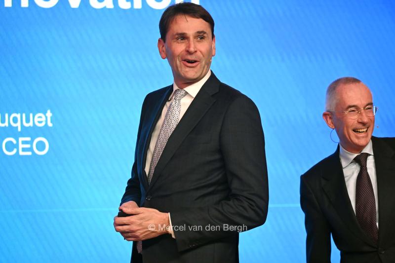 28-1-2026, Nederland, Eindhoven, Veldhoven ASML maakt jaarcijfers bekend. CEO Christophe Fouquet en financieel directeur Roger Dassen (met bril) tijdens de persconferentie. (niet voor Trouw, Parool, AD en NRC)