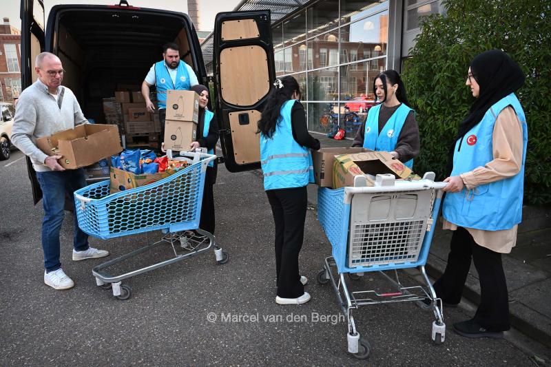 Moskeeen doneren voedsel aan voedselbank aan het einde van de ramadan. Ze hielden een inzamelingsactie en kochten er levensmiddelen voor. Voorzitter van de voedselbank Versteeg (L) neemt het graag in ontvangst.
