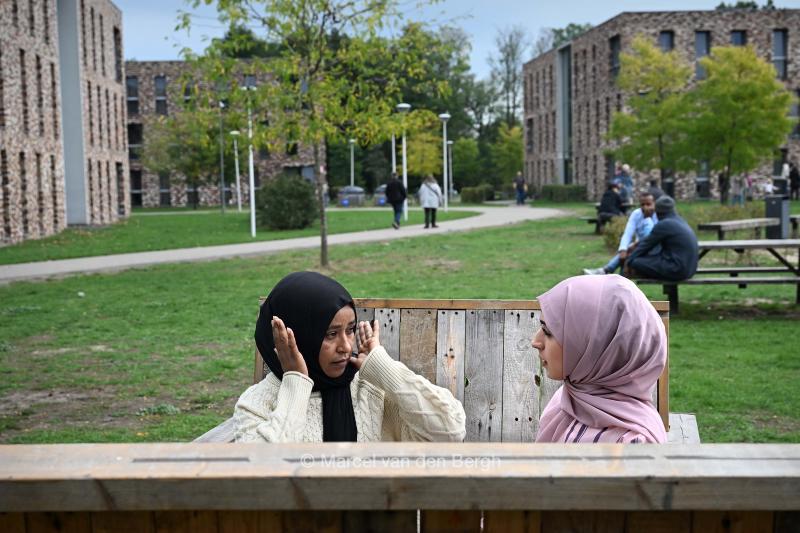 27-9-2025, Nederland, Grave AZC 2 jonge vrouwen vluchtelingen in gesprek op het buitenterrein van het AZC foto Marcel van den Bergh (niet voor Trouw, Parool, AD en NRC)