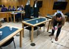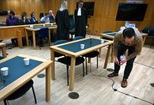 9-12-2025, Nederland, Den Bosch strafzaak rond het Stint-ongeluk begonnen Terwijl de journalisten al in de rechtszaal zitten plakt een medewerker van de rechtbank de snoeren vast behorende bij het tafeltje waar de verdachten komen te zitten. foto Marcel van den Bergh (niet voor Trouw, Parool, AD en NRC)