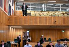 9-12-2025, Nederland, Den Bosch strafzaak rond het Stint-ongeluk begonnen Terwijl de journalisten voor de zitting al de rechtszaal in mogen test een medewerker van de rechtbank nog even het glas van de publieke tribune. foto Marcel van den Bergh (niet voor Trouw, Parool, AD en NRC)