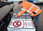 9-3-2026, Nederland, Enschede borden verboden voor fatbikes wat wordt geplaatst in het centrum van Enschede wordt uitgepakt door een medewerker van Onderhoud Enschede BV. (niet voor Trouw, Parool, AD en NRC)