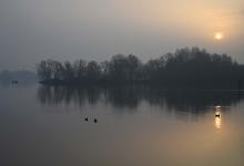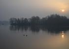 water; rivierengebied; rivier; oppervlaktewater; Maas; zonsopkomst; natuur; nevelig; mist; romantiek; zon; vogels; ganzen; gans; weerspiegeling