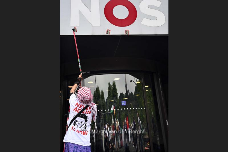 Extinction Rebellion voert actie op het mediapark bij het gebouw van de NOS. De demonstranten eisen dat de NOS verantwoordelijkheid neemt met eerlijke verslaggeving met name over de klimaatverandering en de Palestijnse kwestie.