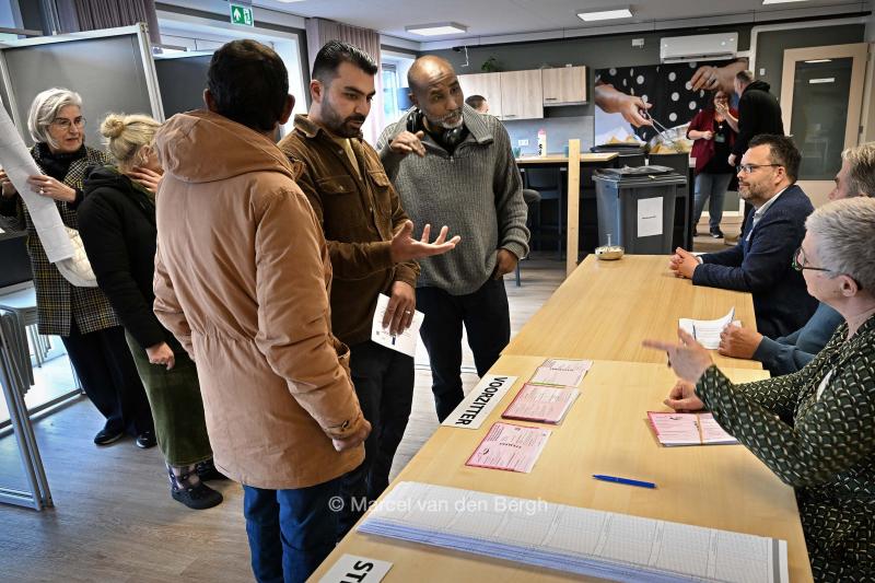 Ossenaren brengen hun stem uit bij de vluchtelingenopvang. Geinteresseerde vluchtelingen van de opvang nemen een kijkje op het stembureau en krijgen uitleg.
