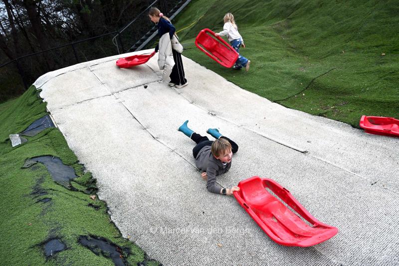 Kinderen hebben plezier met hun sleetjes op een kunstsneeuwhellinkje dat ligt bij de kunstskipiste De Wijchense Berg. De jassen gingen al snel uit.
