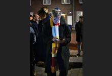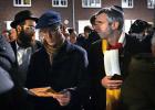 16-12-2025, Nederland, Den Bosch Joden vieren Chanoeka voor de oude synagoge. Een man met Oeteldonk sjaal is 1 van de aanwezigen. foto Marcel van den Bergh (niet voor Trouw, Parool, AD en NRC)