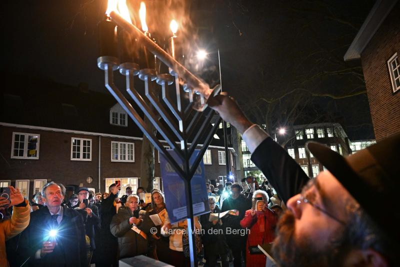 16-12-2025, Nederland, Den Bosch Joden vieren Chanoeka voor de oude synagoge. De rabbijn steekt de kaarsen aan. foto Marcel van den Bergh (niet voor Trouw, Parool, AD en NRC)