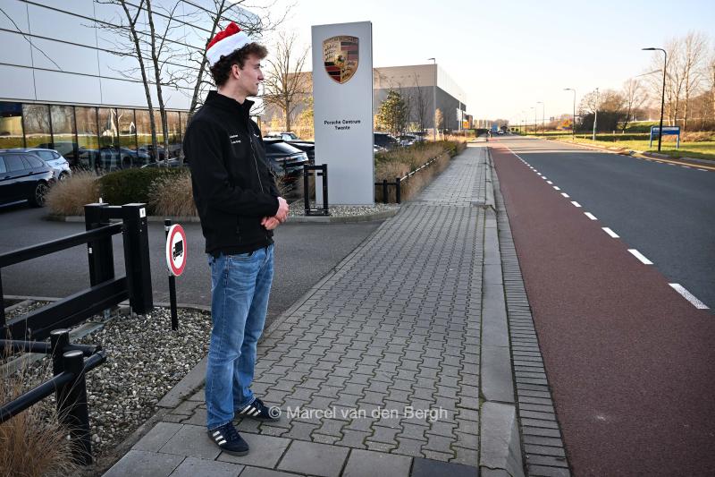 VRIJ 13-12-2025, Nederland, Deventer kerst omdat het moet Een jongeman (verkeersregelaar) moet auto's doorsturen die komen voor de kerstbomenactie van het bedrijf Porsche foto Marcel van den Bergh (niet voor Trouw, Parool, AD en NRC)