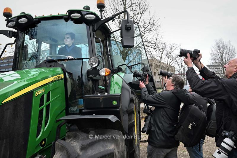 Forum voor Democratie lijsttrekker Lidewij de Vos was 1 van de sprekers. Ze neemt voor de publiciteit even plaats achter het stuur van een trekker.