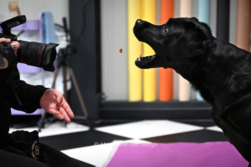 VRIJ 10-12-2025, Nederland, Oud-Beijerland Hondenfotograaf Kimberley van Motherpuppers Studio aan het werk. Tijdens de sessie wordt de hond voortdurend gerustgesteld met brokjes. foto Marcel van den Bergh (niet voor Trouw, Parool, AD en NRC)