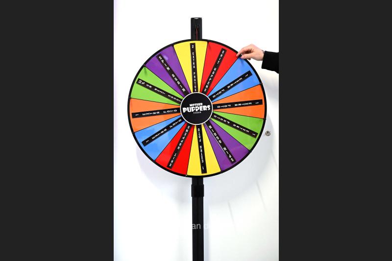 VRIJ 10-12-2025, Nederland, Oud-Beijerland Hondenfotograaf Kimberley van Motherpuppers Studio aan het werk. Klanten kunnen aan een rad draaien en zo een extra prijs winnen. foto Marcel van den Bergh (niet voor Trouw, Parool, AD en NRC)