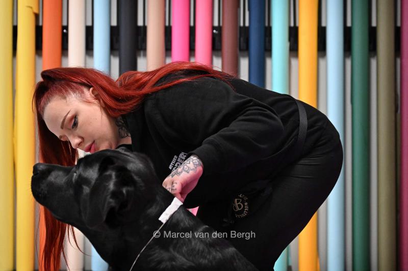 VRIJ 10-12-2025, Nederland, Oud-Beijerland Hondenfotograaf Kimberley van Motherpuppers Studio aan het werk. Ze positioneert de hond. foto Marcel van den Bergh (niet voor Trouw, Parool, AD en NRC)