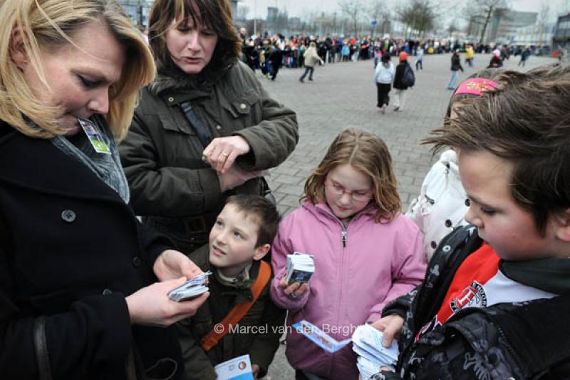 ruilmiddag AH voetbalplaatjes in de Kuip. Al in de rij voor het stadion wordt er druk geruild.