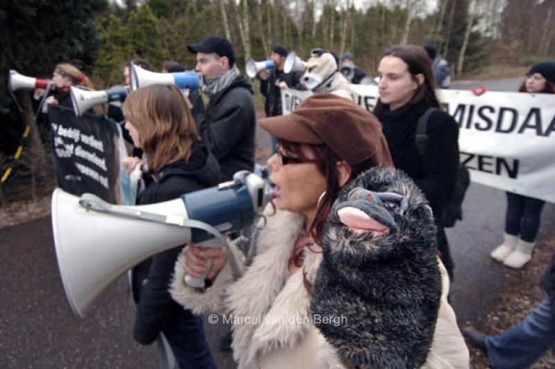 Activisten van de Anti-dierproeven Coalitie demonstreren bij het bedrijf Harlan.