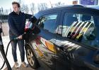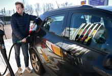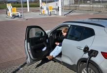 5-3-2026, Nederland, Tiel Hoge brandstofprijzen bij de pomp als gevolg van de oorlog in Iran. Een elektirische rijder maakt zich niet al te druk. (niet voor Trouw, Parool, AD en NRC)