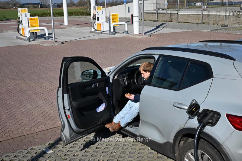 5-3-2026, Nederland, Tiel Hoge brandstofprijzen bij de pomp als gevolg van de oorlog in Iran. Een elektirische rijder maakt zich niet al te druk. (niet voor Trouw, Parool, AD en NRC)