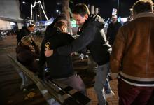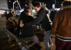 31-10-2025, Nederland, Kampen Gebedsgenezer Jelthe Kloens leidt de geloofsbeweging Schud de Plaatsen. Op straat in Kampen verkondigen zijn volgers het evangelie. Een jongeman op straat wordt aangesproken. foto Marcel van den Bergh (niet voor Trouw, Parool, AD en NRC)