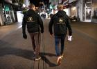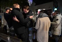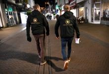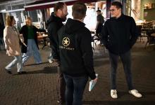 31-10-2025, Nederland, Kampen Gebedsgenezer Jelthe Kloens leidt de geloofsbeweging Schud de Plaatsen. Op straat in Kampen verkondigen zijn volgers het evangelie. Enkele mannen op een terras worden aangesproken. foto Marcel van den Bergh (niet voor Trouw, Parool, AD en NRC)