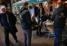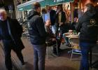 31-10-2025, Nederland, Kampen Gebedsgenezer Jelthe Kloens leidt de geloofsbeweging Schud de Plaatsen. Op straat in Kampen verkondigen zijn volgers het evangelie. Een man op het terras wordt aangesproken. foto Marcel van den Bergh (niet voor Trouw, Parool, AD en NRC)