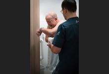 28-10-2025, Nederland, Etten-leur Wijkzorg aan het werk in de wijk. Een oudere man wordt geholpen bij het douchen. foto Marcel van den Bergh (niet voor Trouw, Parool, AD en NRC)