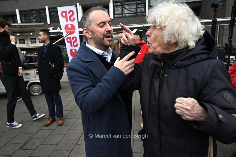De SP probeert bij de Afrikaander Markt kiezers te interesseren voor de gemeenteraadsverkiezingen. Jimmy Dijk in discussie