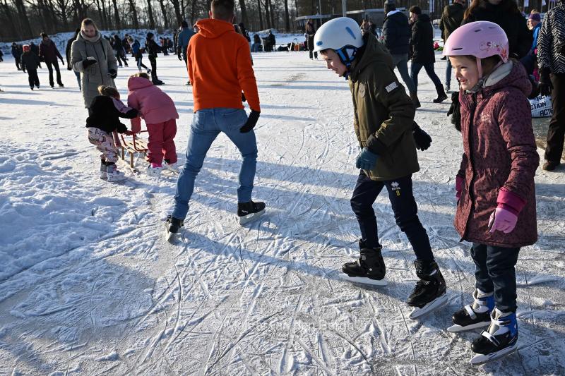 11-1-2026, Nederland, Aalten schaatsen op natuurijsbaan De Hare Een broertje en een zusje hebben net hun schaatsen aan gedaan en doen hun eerste stappen op het ijs. foto Marcel van den Bergh (niet voor Trouw, Parool, AD en NRC)