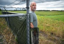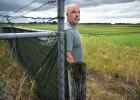 22-8-2025, Nederland, Markelo Evert Slagman met rechts in de achtergrond lelieteelt en links van hem het perceel en hek van de buurman wat deze heeft afgeschermd met een doek tegen bestrijdingsmiddelen. foto Marcel van den Bergh (niet voor Trouw, Parool, AD en NRC)