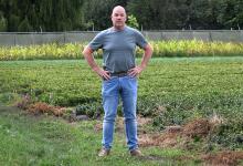 22-8-2025, Nederland, Markelo Evert Slagman bij een geoogst lelieveld. In de achtergrond van hem het perceel en hek van de buurman wat deze heeft afgeschermd met een doek tegen bestrijdingsmiddelen. foto Marcel van den Bergh (niet voor Trouw, Parool, AD en NRC)