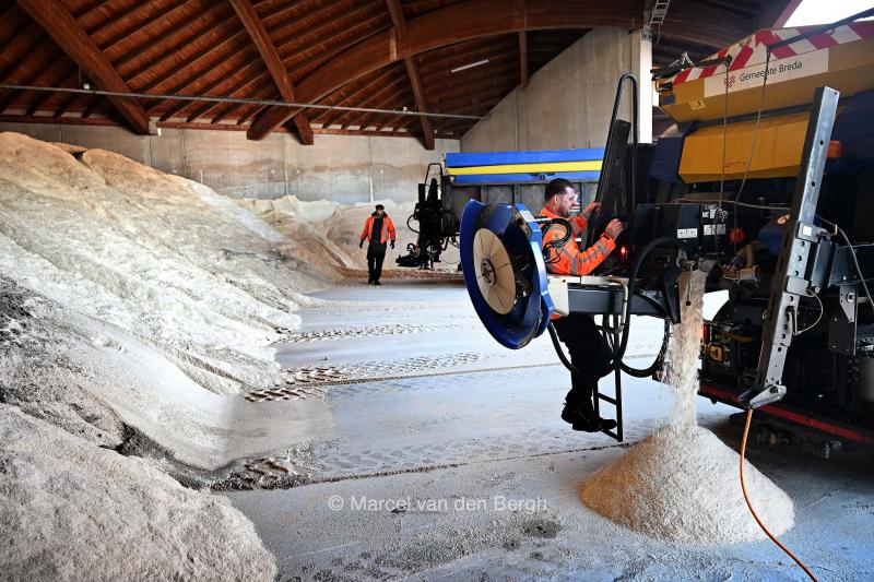 Het laatste zout wordt uit de strooier gehaald om hem schoon te houden totdat hij 's-avonds weer zal worden ingezet.