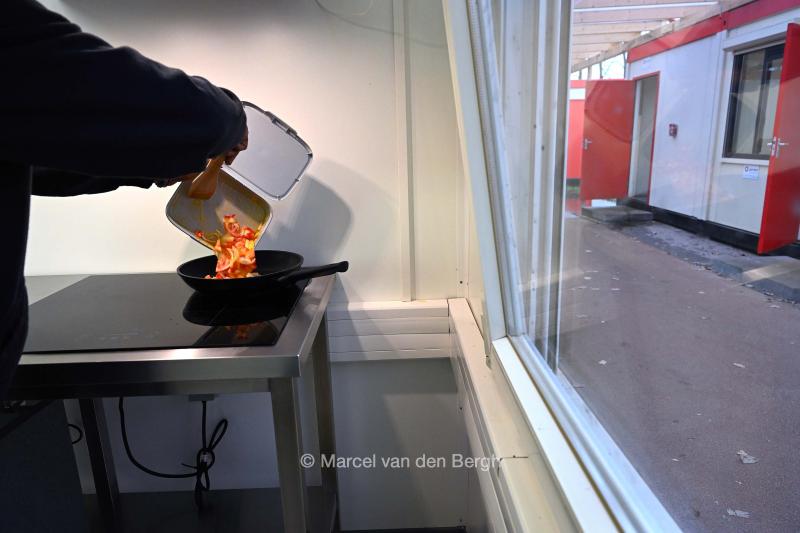 19-11-2025, Nederland, Biddinghuizen tijdelijk aanmeldcentrum AZC op evenemententerrein ter ontlasting van Ter Apel Een jongen maakt zijn eten. foto Marcel van den Bergh (niet voor Trouw, Parool, AD en NRC)