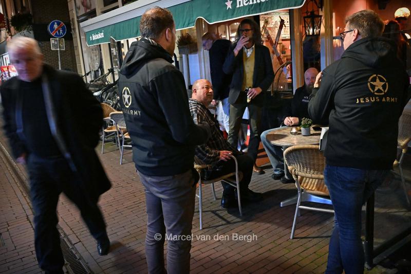 Gebedsgenezer Jelthe Kloens leidt de geloofsbeweging Schud de Plaatsen. Op straat in Kampen verkondigen zijn volgers het evangelie. Enkele mannen op een terras worden aangesproken.