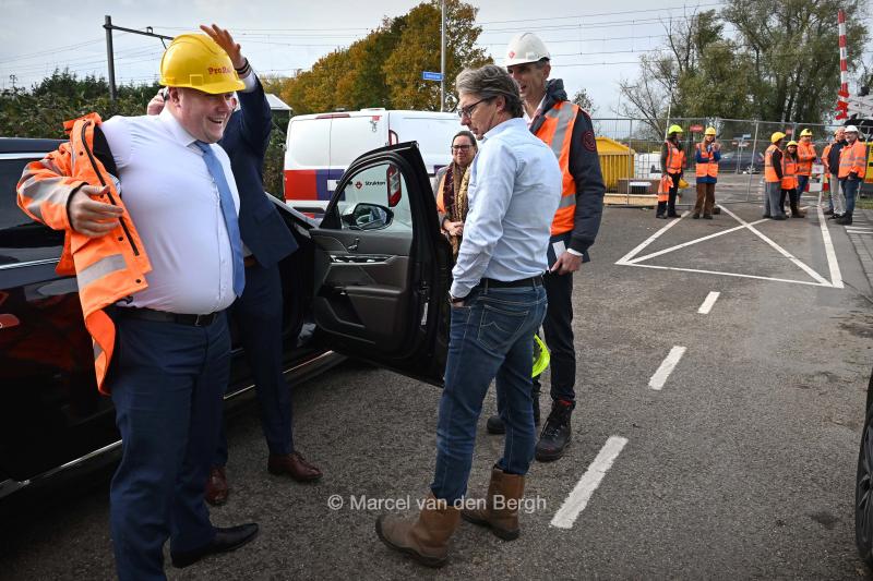 Staatsseccretaris Openbaar Vervoer en Milieu Thierry Aartsen komt een kijkje nemen bij de spoorwegovergang.