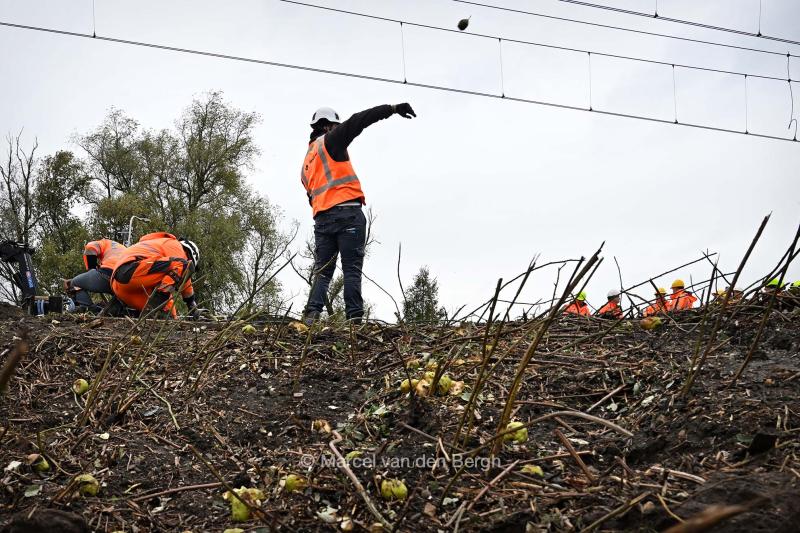 3-11-2025, Nederland, Meteren voor lange tijd geen treinen na botsing tussen trein en vrachtwagen Een Prorail medewerker gooit een peer van het spoor. foto Marcel van den Bergh (niet voor Trouw, Parool, AD en NRC)