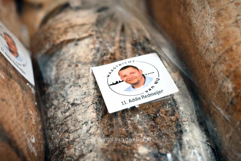 Op het brood bij de Stichting Broodnodig zit een sticker ter aanprijzing van Addie zijn partij, van NU, voor de Gemeenteraadsverkiezingen.