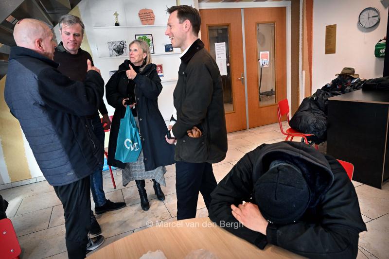 Predikant-directeur Martijn van Leerdam (2e van links) ontvangt lijsttrekker Chantal Zeegers (D66) en Pim Versnel (VVD) in de Pauluskerk. Een client cq bezoeker uiterst links spreekt hen aan.