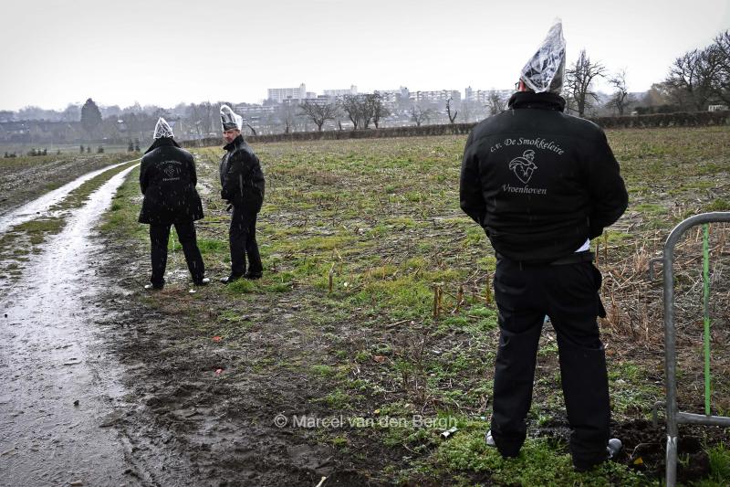 VRIJ 16-2-2026, Nederland, Maastricht Leden van een raad van elf urineren tijdens carnaval in de stromende regen. (niet voor Trouw, Parool, AD en NRC)