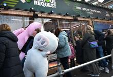 21-12-2025, Nederland, Den Bosch Ouders en hun kinderen bij het Glazen Huis dat geld inzamelt voor Spieren voor Spieren. Een man komt met 2 grote knuffels aan ter donatie. foto Marcel van den Bergh (niet voor Trouw, Parool, AD en NRC)