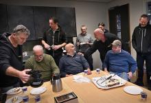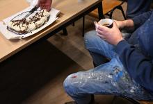 VRIJ 20-12-2025, Nederland, Grubbenvorst carnaval voorbereidingen carnaval In een bouwhal wordt druk aan praalwagens gewerkt door diverse carnavalsverenigingen. Pauze wordt gehouden met rijstevlaai. foto Marcel van den Bergh (niet voor Trouw, Parool, AD en NRC)