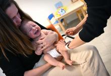 VRIJ 25-3-2026, Nederland, Maasdriel (kleindochter fotograaf, gebruik geen probleem) Moeder bezoekt met haar 3 maanden oude baby (jongetje) het consultatiebureau voor diverse vaccinaties. Haar iets oudere dochtertje mocht mee. Op de foto krijgt hij de prik tegen Pneumokokken. (niet voor Trouw, Parool, AD en NRC)