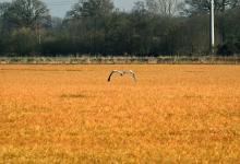 VRIJ 23-3-2026, Nederland, Groenlo Een weiland is doodgespoten met glyfosaat. Een reiger vliegt op. (niet voor Trouw, Parool, AD en NRC)