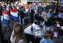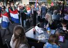 18-10-2025, Nederland, Eibergen demonstratie tegen de komst van een AZC De stoet trekt door de binnenstad en deelnemers worden herkend door mensen op het terras. foto Marcel van den Bergh (niet voor Trouw, Parool, AD en NRC)