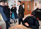 18-2-2026, Nederland, Rotterdam Pauluskerk voor opvang kwetsbare mensen Predikant-directeur Martijn van Leerdam (2e van links) ontvangt lijsttrekker Chantal Zeegers (D66) en Pim Versnel (VVD) in de Pauluskerk. Een client cq bezoeker uiterst links spreekt hen aan. (niet voor Trouw, Parool, AD en NRC)