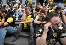 8-8-2025, Nederland, Arnhem Vitesse verliest rechtszaak voor haar voortbestaan als profclub.. Op de Korenmarkt komt het nieuws binnen. Enkele seconden later slaat de vlam in de pan.. foto Marcel van den Bergh (niet voor Trouw, Parool, AD en NRC)