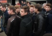 12-12-2025, Nederland, Den Bosch Boeren protesteren bij het provinciehuis tegen de stikstofplannen. Jonge boer in spé bij de bijeenkomst. In de achtergrond luisteren boeren naar de toespraken. foto Marcel van den Bergh (niet voor Trouw, Parool, AD en NRC)